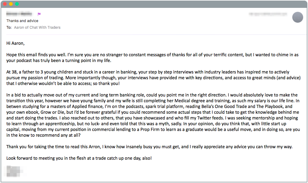 The email comes from a gentleman who’s 38 years old with a full-time job, his wife is currently studying and he has three kids. He also has the goal to transition out of his current career into full-time trading, though he has a family who are dependent on his income. And that’s the part he has questions about.