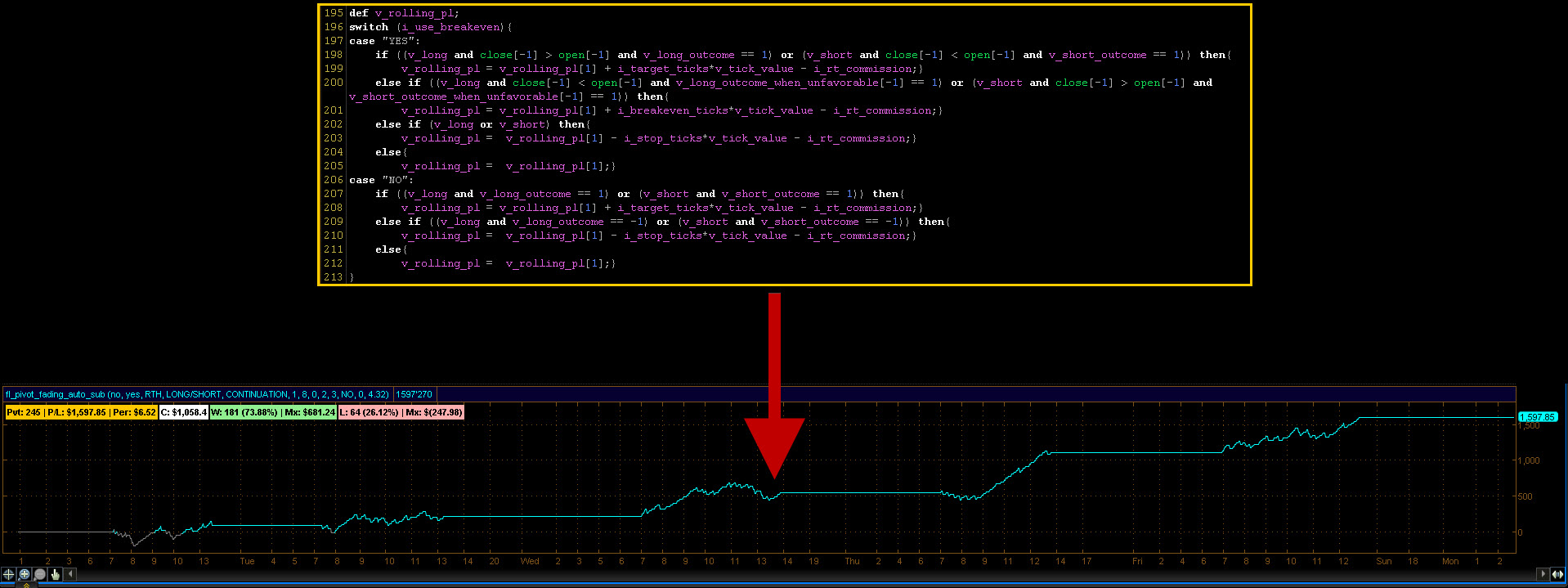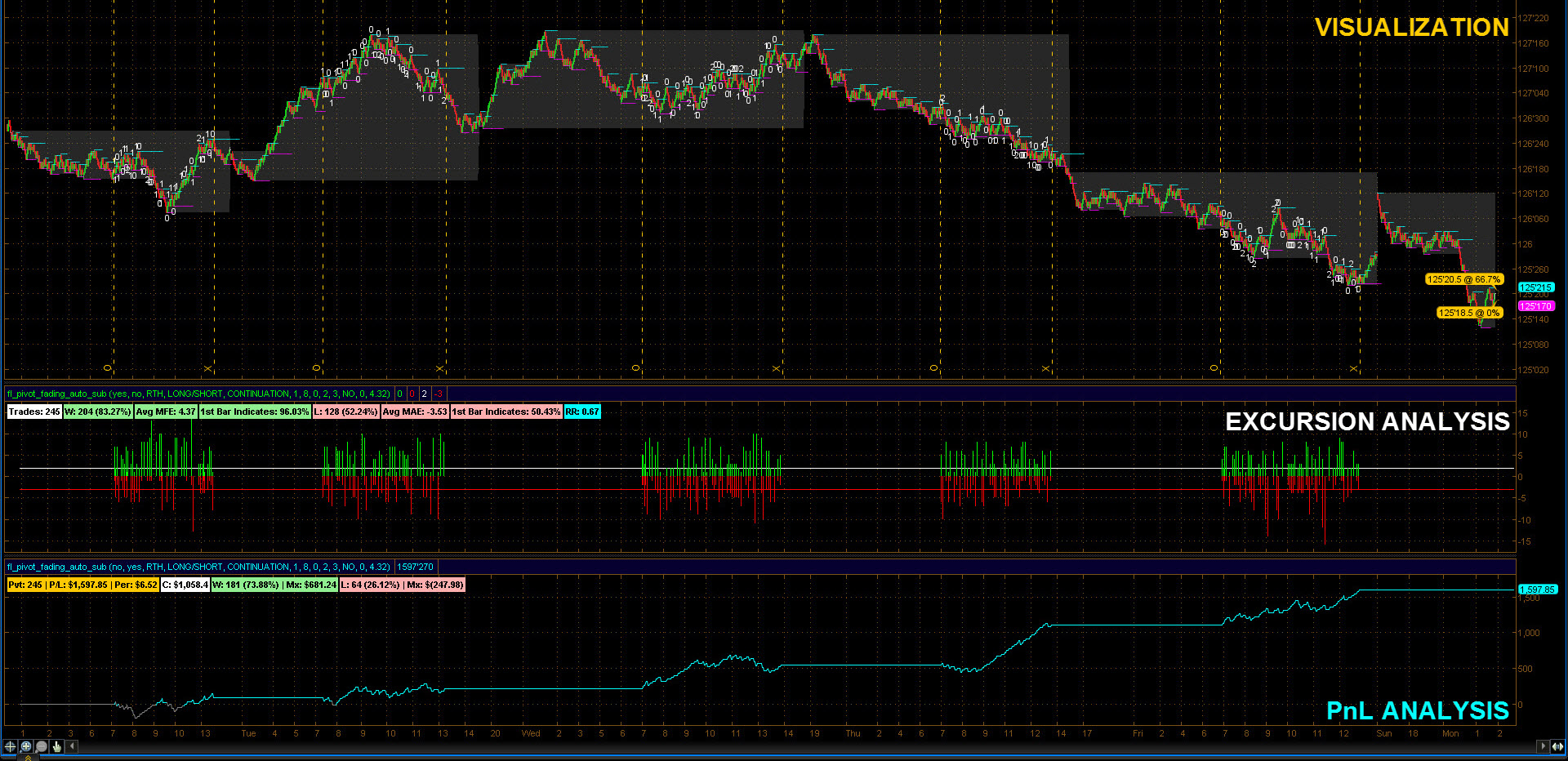 To reference the illustrated system once again, the vast majority of the executable code (over 80% in fact) is actually dedicated to items such as trading-hours configurability (running RTH, ETH, or composite hours), trade direction switching (analyzing long-only, short-only, or long/short implementations), excursion visualization, and the list goes on. The same is true for the code controlling the visual mapping of the strategy elements along with aggregated statistics. For example: