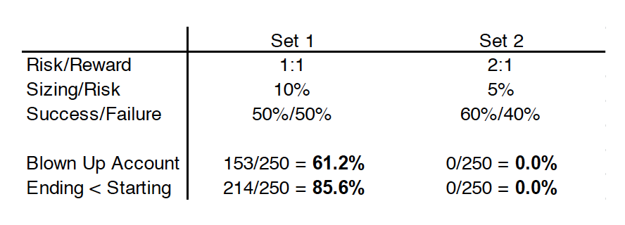 The logical progression from parameterizing on the capital side of the equation to the strategy side is hopefully made more approachable through this example. Conceptualize the relevant components/variables, build a model/methodology, and analyze the outputs; these basic steps form the foundation of the evaluative process in systemizing your trading.